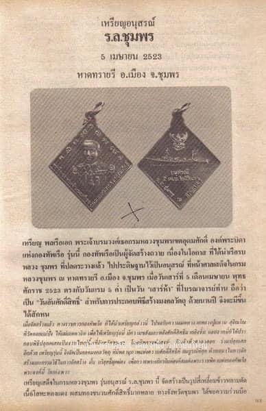 เหรียญกรมมาหลวงชุมพร กองทัพเรือร่วมกับจังหวัดชุมพรสร้างถวาย ในวันที่ ๕ เมษายน ๒๕๒๓ เป็นเหรียญรูปข้าวหลามตัด ในช่วงปี พ.ศ.2518 นาวาเอก จำลอง ประเสริฐยิ่ง ผู้ว่าราชการจังหวัดชุมพร ได้ทราบว่ากองทัพเรือพิจารณาปลดระวางประจำการเรือหลวงชุมพร จึงได้หารือกับกลุ่มอดีตทหารเรือ สมควรขอเรือหลวงชุมพรตั้งไว้เป็นอนุสรณ์ที่หาดทรายรี และ ได้ทำหนังสือแจ้งกองทัพเรือ เมื่อวันที่ 3 กันยายน พ.ศ.2519 และมีการประสานงานต่อเนื้องจนเป็นผลสำเร็จเรียบร้อยในปลายปีพ.ศ. 2520 สมัยนายบุญนาค สายสว่าง เป็นผู้ว่าราชการจังหวัดชุมพร เมื่อนำเรือหลวงชุมพรเข้าที่ตั้งฐานรองรับ ณ หาดทรายรีข้างพระตำหนักศาลเสด็จในกรมหลวงชุมพรฯ ได้มีพิธีต้อนรับ และ ฉลองเรือหลวงชุมพร เมื่อวันศุกร์ที่ 11 กรกฏาคม 2523 ดังนั้น เนื่องในโอกาส ที่ได้นำเรือรบหลวง ชุมพร ที่ได้ปลดระวางแล้ว ขึ้นประดิษฐานไว้เป็นอนุสรณ์ ที่หน้าศาลเสด็จในกรมหลวงชุมพร ณ หาดทรายรี อำเภอเมืองชุมพร จังหวัดชุมพร กองทัพเรือร่วมกับจังหวัดชุมพรจึงจัดสร้างเหรียญ "รุ่น อนุสรณ์ ร.ล. ชุมพร" ถวาย เมื่อวันที่ ๕ เมษายน ๒๕๒๓ ตรงกับแรม ๕ ค่ำ เป็นวันเสาร์ ๕ ที่โบราณจารย์ ถือว่าเป็นวันอันศักดิ์สิทธิ์ สำหรับการประกอบพิธีพุทธาภิเษก วัตถุมงคลต่างๆ เพราะนานปี จึงจะมีขึ้นสักหน เมื่อได้จัดสรา้งแล้ว ทางกองทัพเรือได้นำเหรียญดังกล่าวนี้ ไปขอรับความเมตตา จากหลวงปู่แหวน สุจิณโณ วัดดอยแม่ปั๋ง ได้แผ่เมตตาจิต และได้ประกอบพิธีปลุกเสกเป็นงานใหญ่ขึ้นที่จังหวัดชุมพร โดยมี หลวงพ่อสงฆ์ วัดเจ้าฟ้าศาลาลอย เมตตาร่วมปลุกเสก เหรียญรุ่นนี้ จึงจัดเป็นมงคลวัตถุ ที่พลานุภาพแห่งความศักสิทธิิ์ สมบูรณ์เป็นที่สุด ด้วยวัตถุประสงค์การจัดสร้าง และกรรมวิธีการจัดสร้าง ขึ้นนั้น บริสุทธิ์ เพื่อถวายพระเกียรติ แด่ องค์พระบิดาแห่งกองทัพเรือไทย