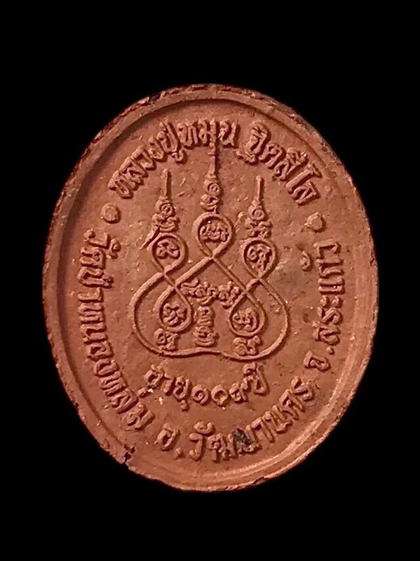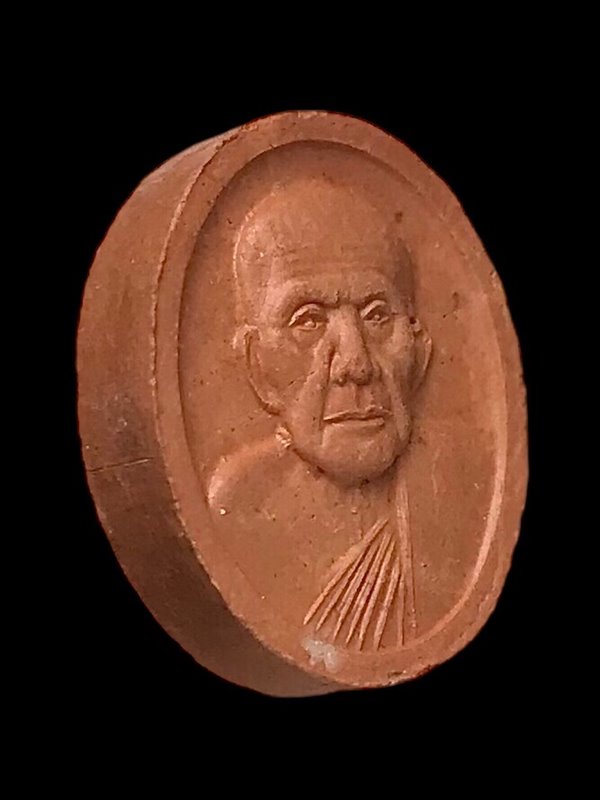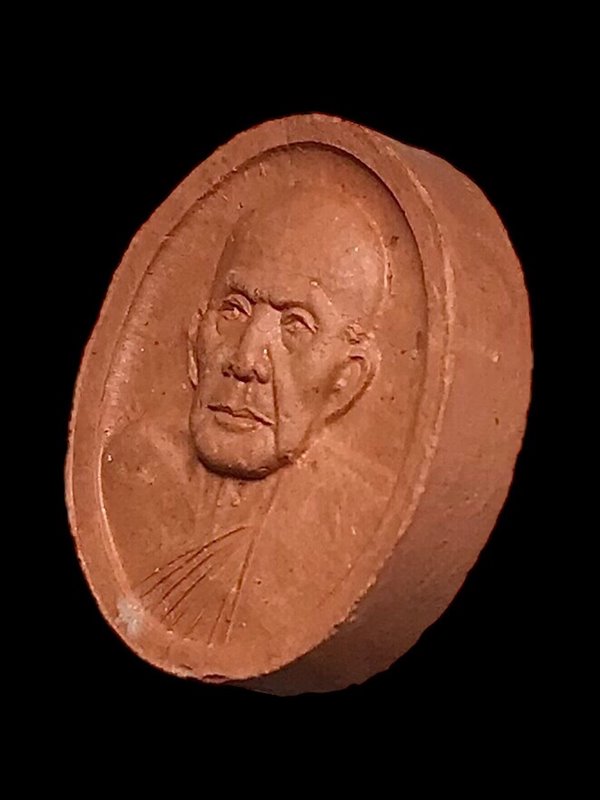 พระรูปเหมือนเนื้อดิน รูปไข่ องค์ขนาดเม็ดแตง แต่หนา สภาพสวย ไม่ทราบที่ครับ