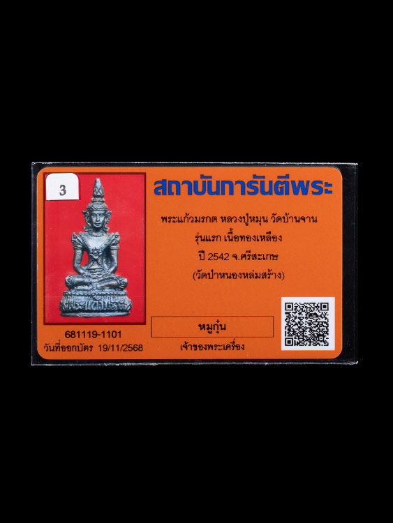 วัดใจครับ รูปหล่อพระแก้วมรกต หลวงปู่หมุน วัดบ้านจาน รุ่นแรก เนื้อทองเหลือง ปี2542 จ.ศรีสะเกษ (วัดป่าหนองหล่มสร้าง)มีกล่องเดิม พร้อมบัตรจีพระครับ