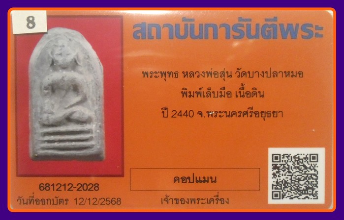 บัตรการันตี-3500-พระเนื้อดินหลวงพ่อสุ่น วัดบางปลาหมอ (พระอาจารย์ของหลวงพ่อปาน วัดบางนมโค) พศ.2440