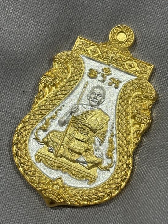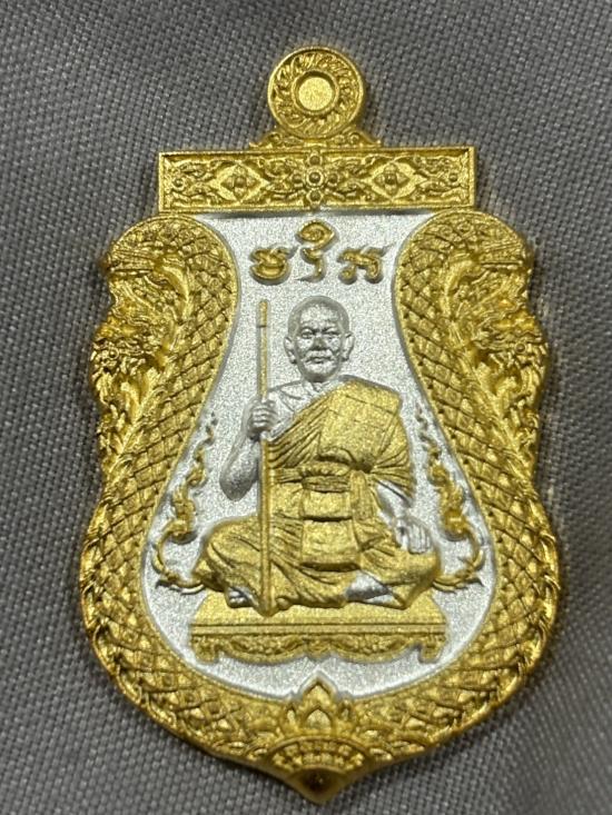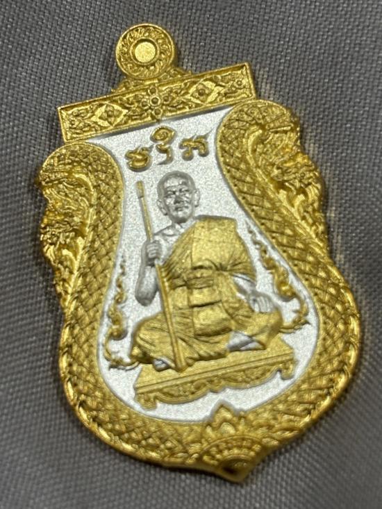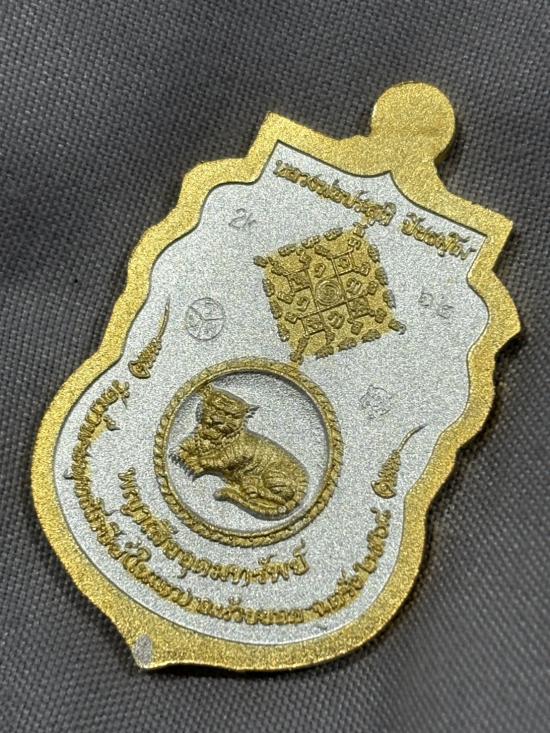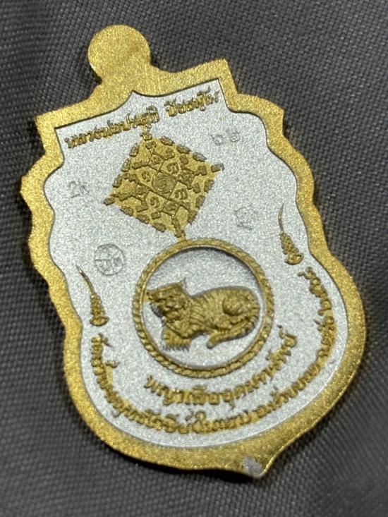 เหรียญเสมาพญาเสืออุดมทรัพย์ พระอาจารย์ประสูติ (หลวงพ่อประสูติ) วัดในเตา ตรัง เนื้อ2K องค์2K พื้นเงิน ขอบทอง หมายเลข62