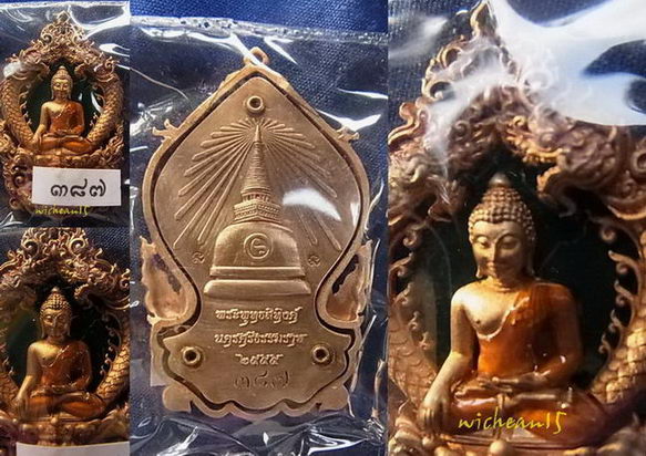 เหรียญฉลุยกองค์ พระพุทธสิหิงค์ วัดมหาธาตุวรมหาวิหาร เนื้อบรอนซ์แก่ทองคำลงยา สีเขียว สภาพสวยพร้อม กล่องเดิม หมายเลข ๓๘ ปัจจุบันเลี่ยมกันน้ำรักษาผิวแล้วครับ