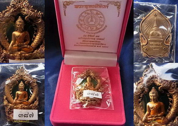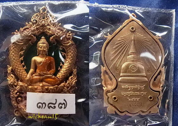 เหรียญฉลุยกองค์ พระพุทธสิหิงค์ วัดมหาธาตุวรมหาวิหาร เนื้อบรอนซ์แก่ทองคำลงยา สีเขียว สภาพสวยพร้อม กล่องเดิม หมายเลข ๓๘