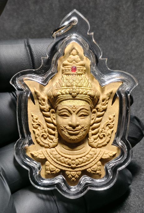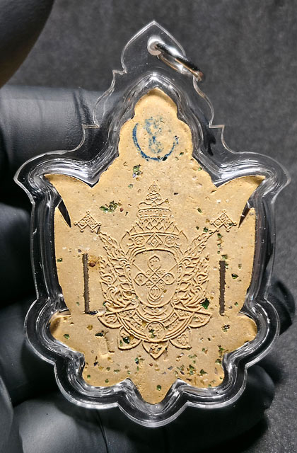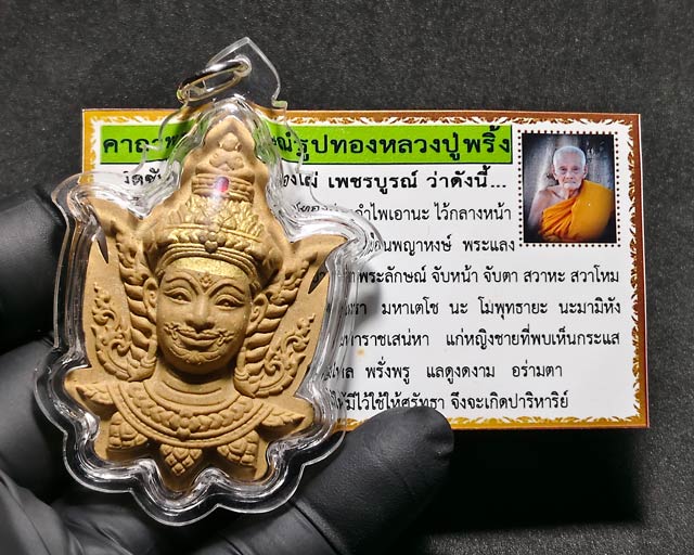 พระลักษณ์หน้าทอง องค์ครู หลวงปู่พริ้งวัดซับชมพู่ จ.เพชรบูรณ์ ด้านหลังฝังตระกรุด 2 ดอก สร้างจำนวน 336 องค์