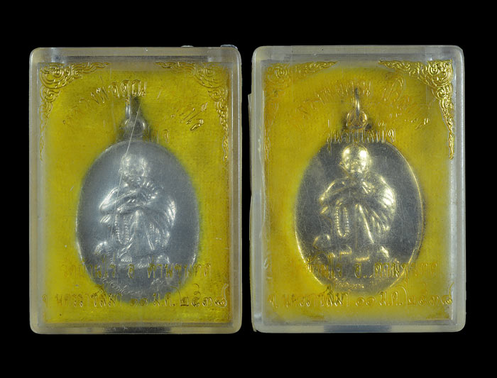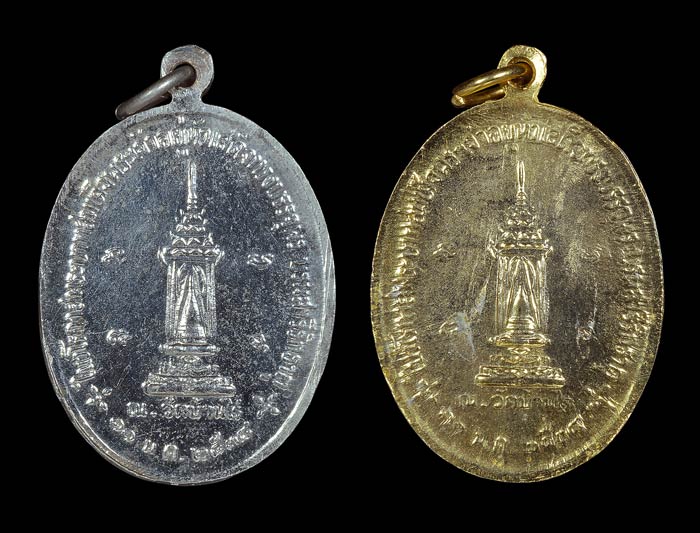 เหรียญ ในวโรกาสพระบาทสมเด็จพระเจ้าอยู่หัวเสด็จทรงบรรจุพระบรม สารีริกธาตุ ( เนื้อกะไหล่เงิน - ทอง ) พ.ศ.2538 ( กล่องเดิม , รับพระ 2 เหรียญ )