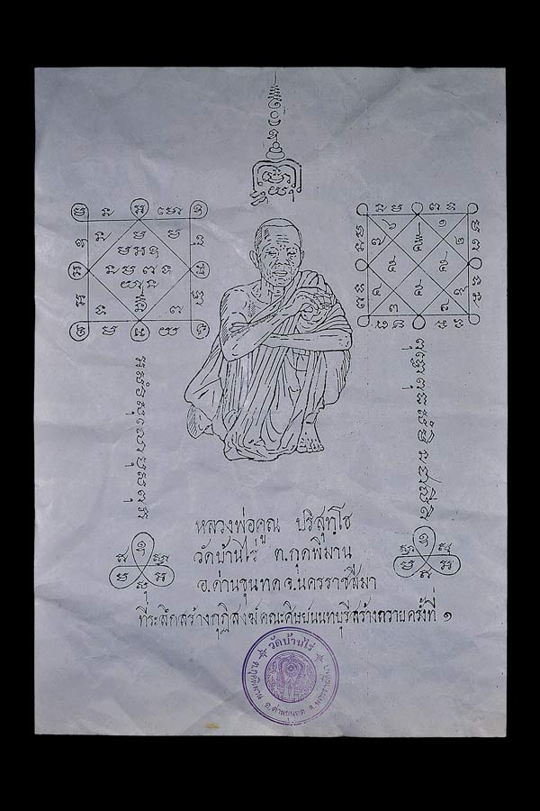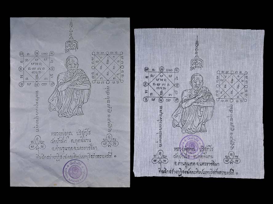 ผ้ายันต์ ( ผ้าครู 9 x 10 นิ้ว ) + กระดาษยันต์ ( 8 x 11.5 นิ้ว ) ที่ระลึกสร้างกุฏิสงส์ คณะศิษย์นนทบุรี สร้างถวาย พ.ศ.2529 ( ปั๊มตราวัดบ้านไร่ )