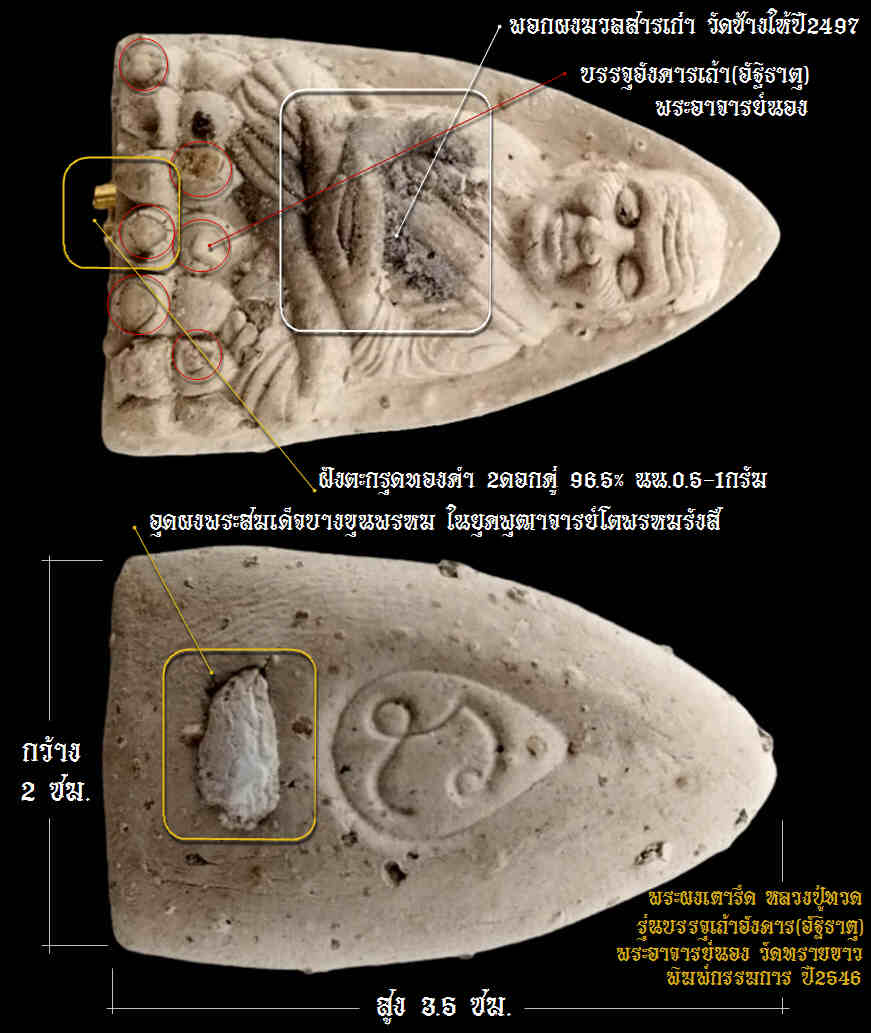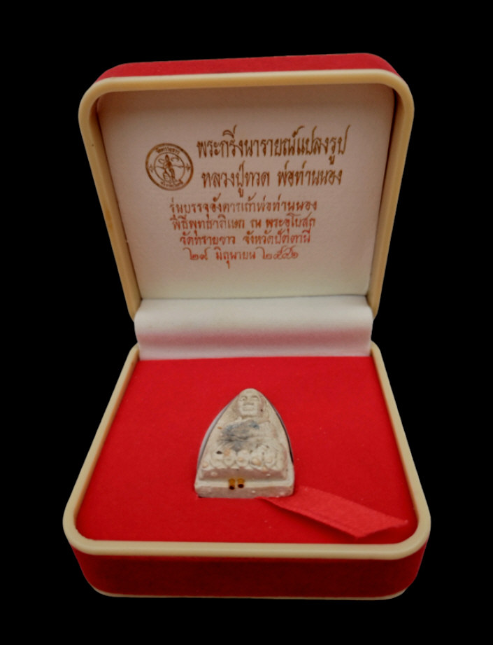 พระผงเตารีด หลวงปู่ทวด รุ่นบรรจุอังคารเถ้า(อัฐิธาตุ) พระอาจารย์นอง พิมพ์กรรมการ ฝังตะกรุดทองคำคู่ วัดทรายขาว ปัตตานี กล่องเดิม ปี2546 1ใน299 (พอกผงมวลสารเก่าวัดช้างให้ปี2497 อุดผงบางขุนพรหมสมเด็จโต)