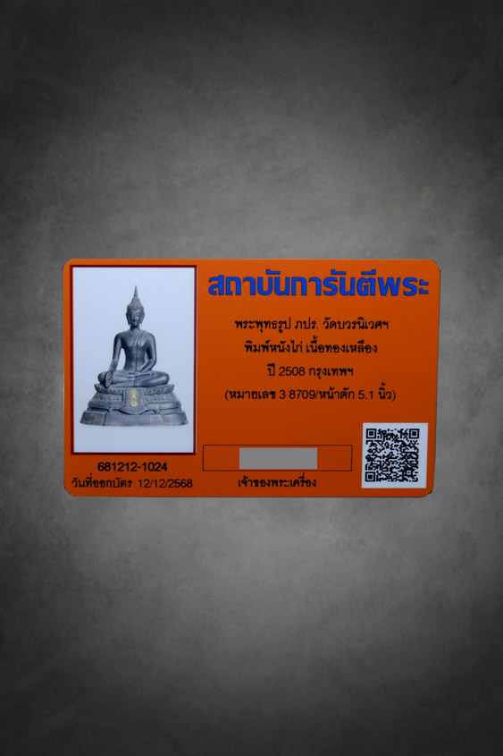 พระบูชา ภปร.ปี 2508 วัดบวรนิเวศวิหาร บล็อคหนังไก่ หน้าตัก 5 นิ้วมาพร้อมบัตรการันตีแท้ (หมวด3 หมายเลของค์พระ 8709)