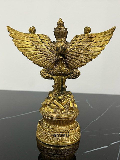 พญาครุฑบูชา พระอาจารย์วราห์ วัดโพธิ์ทอง กรุงเทพมหานคร รุ่นเหยียบเงินเหยียบทอง พิมพ์เล็ก เนื้อทองเหลืองกะไหล่ทอง ปีพ.ศ 2540
