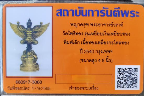 เคาะเดียว***พญาครุฑบูชา พระอาจารย์วราห์ วัดโพธิ์ทอง กรุงเทพมหานคร รุ่นเหยียบเงินเหยียบทอง พิมพ์เล็ก เนื้อทองเหลืองกะไหล่ทอง ปีพ.ศ 2540