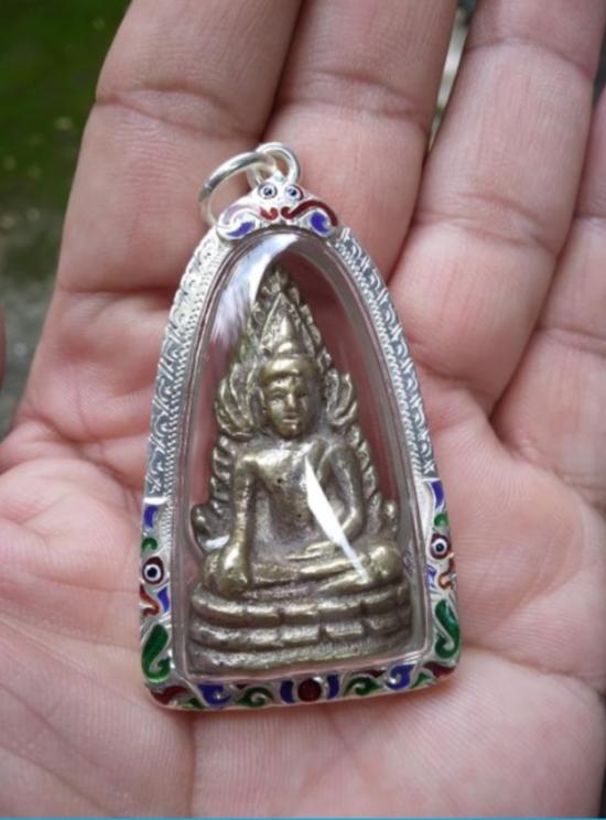 พระพุทธชินราชรุ่นอินโดจีน พิมพ์ต้อบัวเล็บช้าง ผิวพรายเงิน เลี่ยมกรอบเงินลงยา พร้อมบูชาพร้อมบัตรสถาบันการันตี
