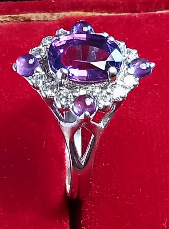 แหวนเงินแท้เคลือบทองคำขาว หัวอะเมทิสล้อมเพชรรัสเซีย งานหรูหรามาก พลอยเกรดดีมากน้ำใสกิ๊ก ไซซฺ์ประมาณ 56-57 น่ำหนักประมาณ 3.47 กรัม (เกือบสลึง) งานมือหนึ่งไม่ผ่านการใช้ครับ งดงามแข็งแรงทนทาน สภาพสวยกริบตามรูป ส่งฟรีทั่วไทย รับประกันตามกฎครับ
