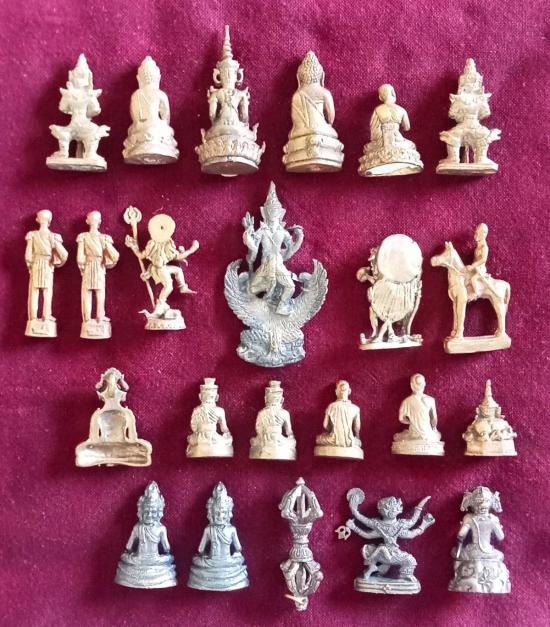 รูปหล่อหลายองค์ ไม่ทราบที่ เนื้อทองเหลืองบ้าง ทองเหลืองรมดำบ้าง ขนาดห้อยคอ รวม 23 องค์ มีหลากหลาย ทั้ง พระศรีอารยเมตตรัย พระกริ่ง พระอุปคุต ท้าวเวสสุวรรณ พระนารายณ์ กรมหลวงชุมพรฯ พระบรมรูปทรงม้า ร. 5 พระฤๅษี หมอชีวก พระราหู หนุมานแผลงฤทธิ์ และเครื่องราง เป็นต้น ราคาวัดใจเบา ๆ ตกองค์ละ 15 บาทเท่านัั้นครับ สภาพไม่ผ่านการใช้ตามรูป ส่งฟรีทั่วไทย รับประกันตามกฎครับ