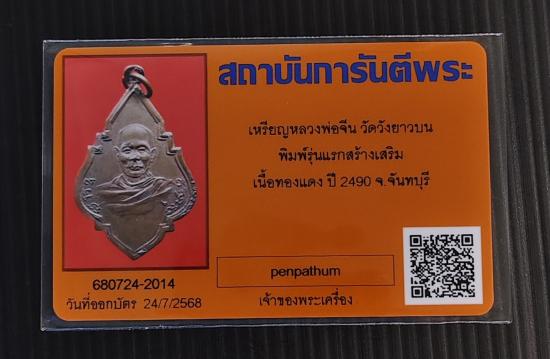 เหรียญหลวงพ่อจีน วัดวังยาวบน จ.จันทบุรี พิมพ์รุ่นแรก ปี2490 เนื้อทองแดง+บัตรจี