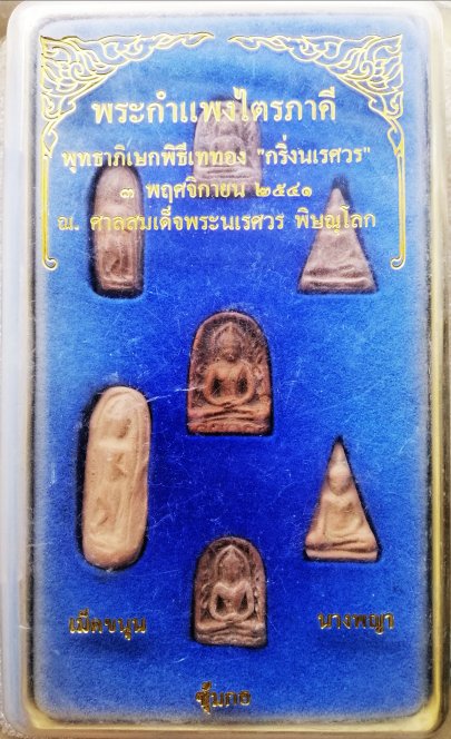 ชุดพระกำแพงไตรภาคี พระเม็ดขนุน ซุ้มกอ นางพญา รวม ๗ องค์ เนื้อดิน พุทธาภิเษกพิธีเททอง "กริ่งนเรศวร" เมื่อวันที่ ๓ พฤศจิกายน ปี2541 ณ.ศาลสมเด็จพรนเรศวร จ.พิษณุโลก ครบชุด