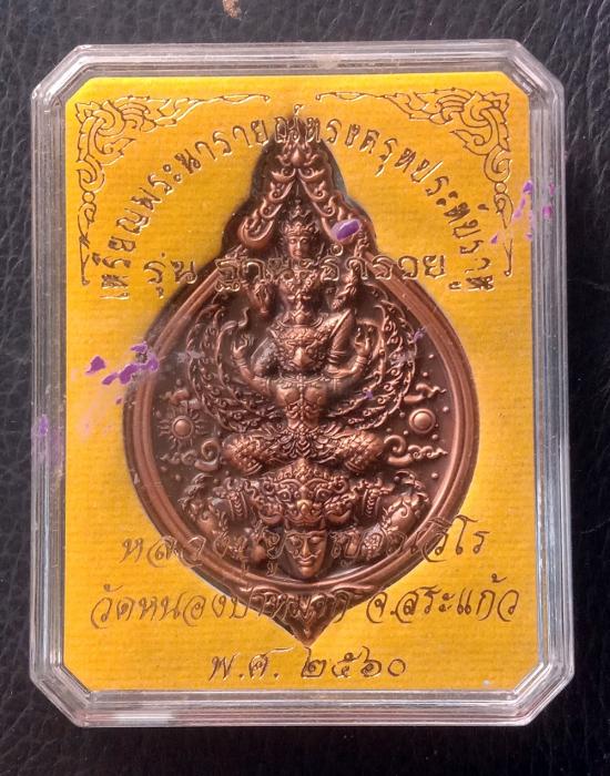 งานพุทธศิลป์ เหรียญพระนารายณ์ทรงครุฑประทับราหู "ฐานะร่ำรวย" หลวงปู่ยูร วัดหนองป่าหมาก (สระแก้ว) เนื้อเทวฤทธิ์แดงรมดำ พร้อมกล่อง ขนาดของเหรียญ 3.5 x 5.5 เซนติเมตร พุทธศิลป์ออกแบบได้งดงาม