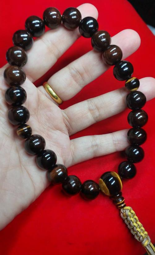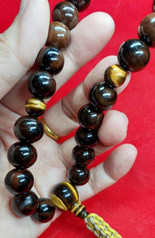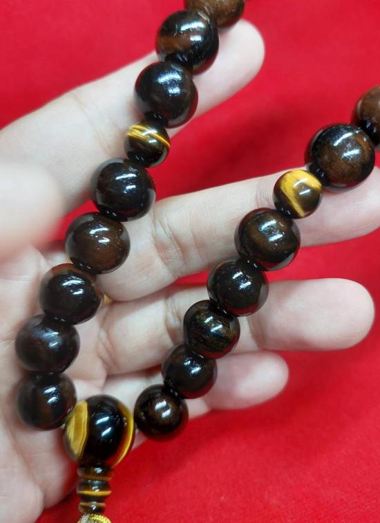 ประคำข้อมือไม้จันทน์ลายเสือ กับ หินตาเสือเกรดพรีเมี่ยม มีสีเข้ม สวยงาม และมีลายที่วิ้งค์ชัดเจน 15 มิล สวยๆ ยาว 30 Cm.