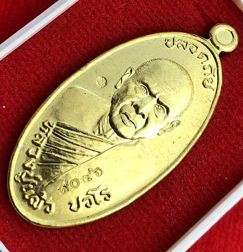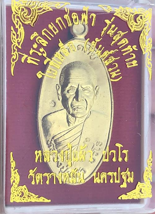เหรียญใบขี้เหล็ก รุ่นสุดท้าย หลวงปู่แผ้ว เนื้อฝาบาตร หมายเลข ๙๐๔๖ พร้อมกล่องเดิม