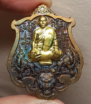 เหรียญมนต์พญาเสือเฒ่านอนกิน เนื้อสัตตะโลหะ หน้ากากปลอกลูกปืน หลังฝังตะกรุด หมายเลข 668 หลวงพ่อไฉน วัดสังฆปรีดี ผิวรุ้งสวยๆ พร้อมกล่องเดิม