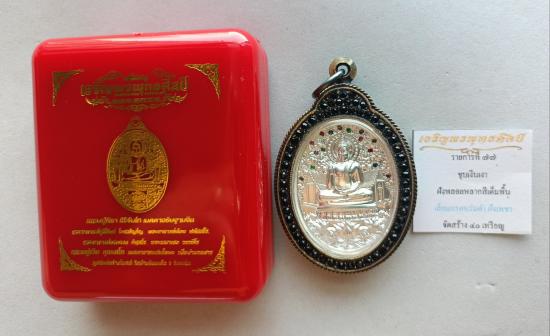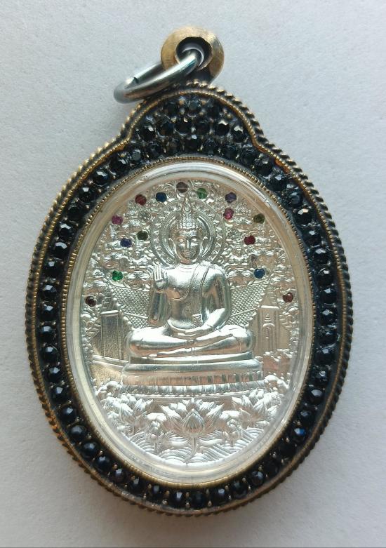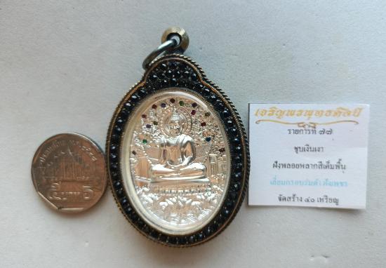 วัดใจเคาะเดียวแดงจ้า เหรียญเจริญพรพุทธศิลป์ หลวงปู่ศิลา พระอาจารย์ต้อม หลวงพ่อสุร ิยันต์ หลวงปู่เวิ่น เสก เนื้อชุบเงินเงา ฝังพลอยหลากสีเต็มพื้น เลี่ยมกรอบรมดำฝังเพชร เคาะเดียวแดงจ้า
