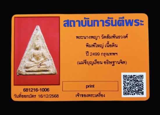 พระนางพญา แม่ชีบุญเรือน วัดสัมพันธวงศ์ เนื้อดิน ปี 2499 พร้อมบัตรรับรอง ครับ