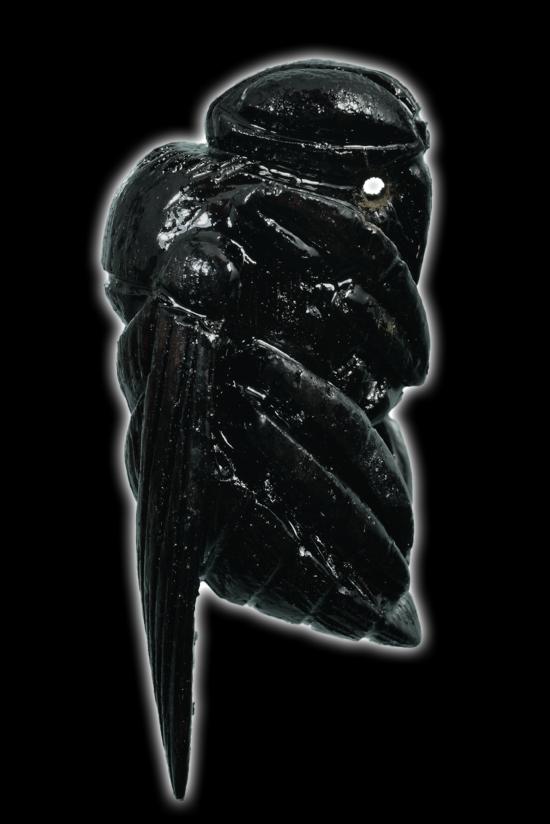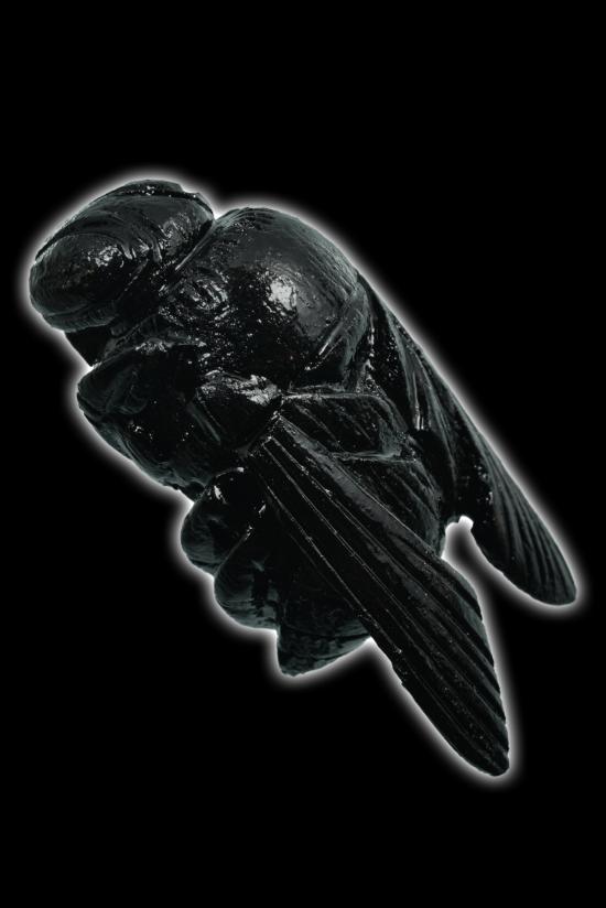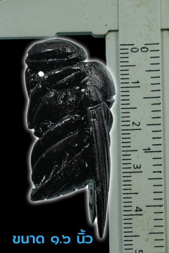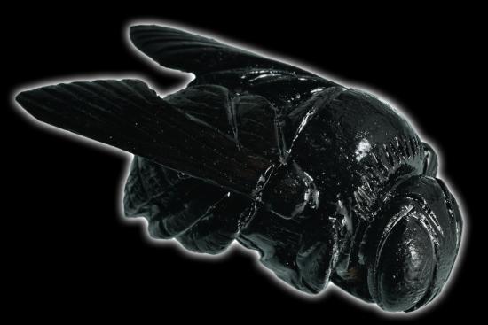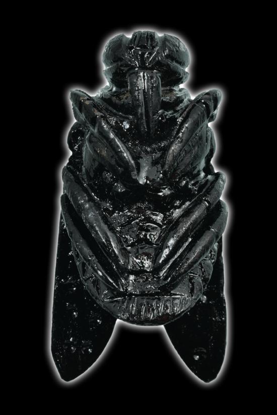 แมลงภู่คำ วัสดุหลัก เนื้อไม้ดุมล้อ ส่วนประกอบ มีปรอทบรรจุภายใน การตกแต่ง ลงรัก ขนาด 1.6 นิ้ว ผู้แกะ/ผู้สร้าง พ่อครูสละปะอ่อง คำดี