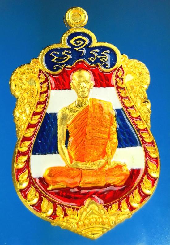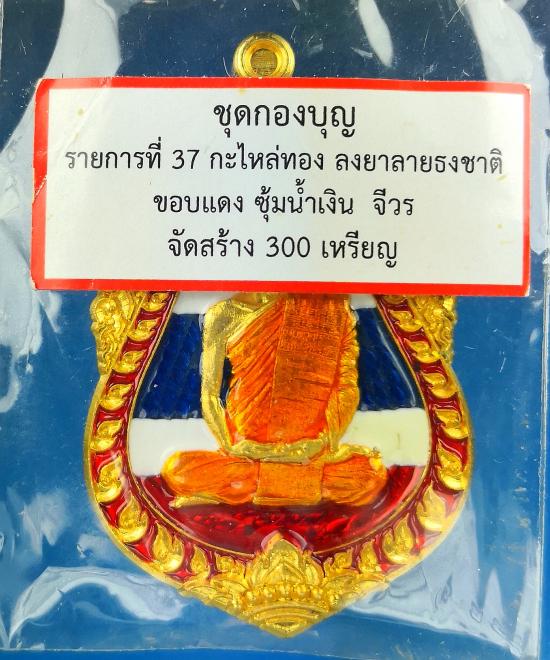 1300-เคาะเดียว เหรียญเสมาอุดมทรัพย์ พระอาจารย์ต้อม วัดท่าสะแบง ชุดกองบุญ เนื้อกะไหล่ทอง ลงยาธงชาติ ขอบแดง ชุ้มน้ำเงิน ลงยาจีวร เลข๑๓๔ เสมาใหญ่พิมพ์นิยม