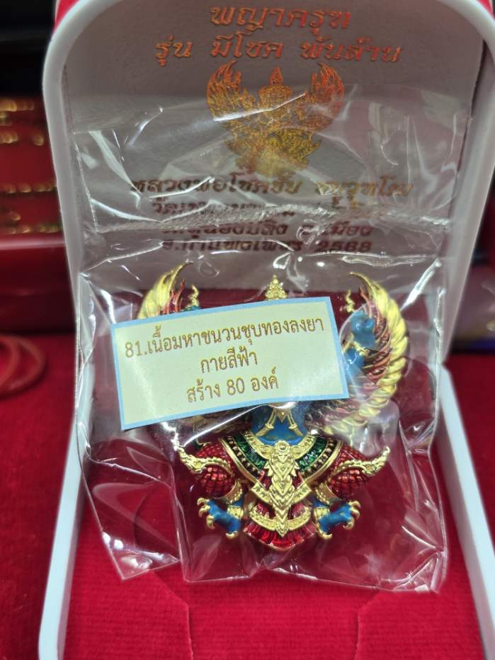 พญาครุฑ รุ่นมีโชคพันล้าน หลวงพ่อโชคชัย วัดน้ำดิบ เนื้อมหาชนวนชุบทองลงยากายฟ้า สร้าง 80 องค์ หมายเลข 56