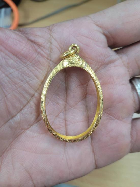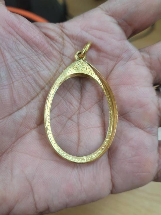 กรอบทองคำแท้ ทรงเหรียญรูปไข่ ยกซุ้มหัวสิงห์ น้ำหนักประมาณ 5.9 กรัม เปอร์เซ็นสูง 83.88%