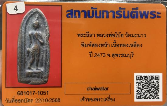 พระลีลา หลวงพ่อโบ้ย วัดมะนาว พิมพ์สองหน้า เนื้อทองเหลือง ปี 2473 จ.สุพรรณบุรี