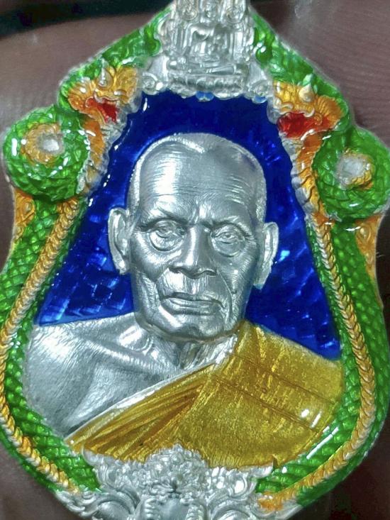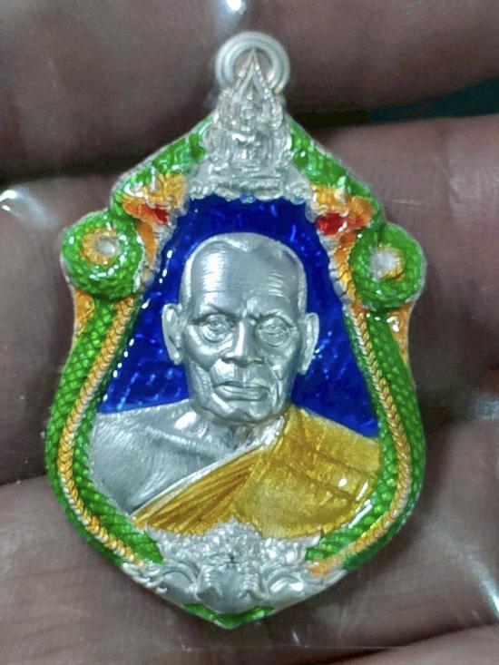 เหรียญเจ้าสัว หลวงพ่อพัฒน์ วัดห้วยด้วน จ.นครสวรรค์ เนื้อเงินลงยา 3 สี พื้นน้ำเงิน ตอกโค๊ต ราหู ตอกโค๊ต นะ ตอกหมายเลข 1249