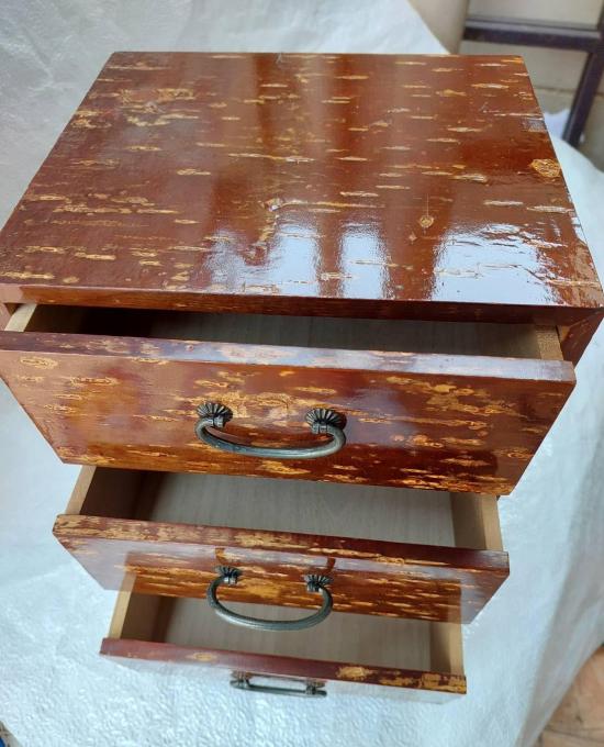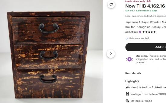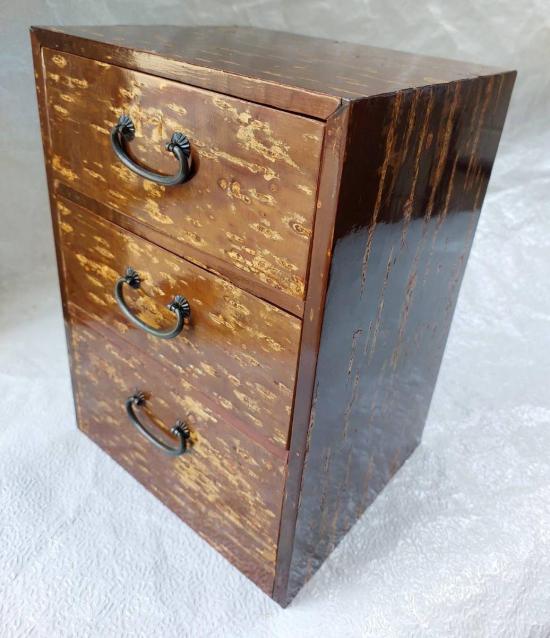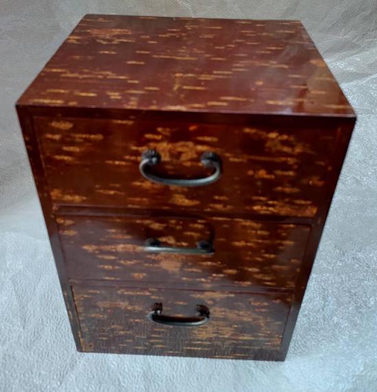 กล่องไม้วินเทจญี่ปุ่น งานฝีมือเก่า 3 ลิ้นชัก สามารถวางพระบูชา 5 นิ้วได้ ขนาด 18 x 22 x สูง 30 ซม.ทำจากเปลือกเชอร์รี่(ต้นซากุระ)รอบใบ |
