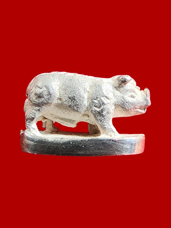 ลักษณะและเนื้อวัตถุมงคล: เป็นหมูขนาดเล็กจิ๋ว เนื้อเงินแท้ และมักจะพบเห็นในสภาพสวยเดิม องค์จริงจะมีลักษณะอ้วนกว่าของเลียนแบบในตลาด |