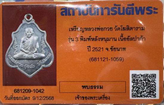 เหรียญหลวงพ่อกวย หลังหนุมาน งานผูกพัทธสีมาฝังลูกนิมิต ปี 2521 เนื้ออัลปาก้าสวยเดิม นิยมสุด เป็นเหรียญยอดนิยม เหรียญนึงของหลวงพ่อกวย พุทธคุณเต็มเปี่ยม เหมือนสักหนุมานกับหลวงพ่อเลยทีเดียว สวยงามทั้งรูปทรง และรูปแบบของเหรียญ ปัจจุบันหาไม่ได้ง่าย ๆ แล้วสำหรับเหรียญสวย ๆ ประสบการณ์กับเหรียญนี้สุดยอดทั้งนั้นครับ เหรียญหลังหนุมาน หลวงพ่อกวย วัดโฆสิตาราม จังหวัดชัยนาท หลวงพ่อกวยท่านเป็นอาจารย์สัก ที่ขึ้นชื่อและนิยมกันอย่างมากคือ ลายหนุมานเชิญธงที่สีข้าง คนจริงทั้วประเทศหลั่งไหลกันมายกขันครูสักยันต์กับหลวงพ่อตั้งแต่หลังสงครามโลกครั้งที่ 2 จนเลิกสักนับได้หลักฐานจากสมุดบันทึก สี่หมืนกว่าคน ยุคเปลี่ยน สังขารและภาระประกอบกับวิวัฒนาการเทคโนโลยีหลวงพ่อล่วงรู้ ผลัดเปลี่ยนต้องมีทดแทน ท่านจึงคิดค้นสิ่งที่ทดแทนการสักลายลงสีข้างคน นั่นคือเหรียญหลังหนุมาน ไว้ให้กับลูกศิษย์ในยุคถัดมาใช้ติดตัวแทน และเป็นเรื่องจริงคือท่านทำได้สำเร็จดีดังเดิมเฉกเช่นกับลงเข็มสักอย่างไงอย่างงั้น ปลุกขึ้นขลังได้ไม่แตกต่าง เพราะแรงครูใครถือของขึ้นก็ได้เปรียบเพราะหนุมานตัวนี้ของหลวงพ่อมีฤทธิ์อย่างมาก เหรียญหลวงพ่อกวย รุ่น ๓ พ.ศ.๒๕๒๑ หรือที่เรียกกันว่า "เหรียญรุ่นฝังลูกนิมิต" ออกให้ทำบุญเนื่องในโอกาส ผูกพัทธสีมาและฝังลูกนิมิต ในปี พ.ศ.๒๕๒๑ มีทั้งหมดด้วยกัน ๓ พิมพ์คื่อ ๑. พิมพ์หลังหนุมานเชิญธง หรือที่เรียกกันติดปากว่า "เหรียญหลังหนุมาน" เป็นเหรียญปั๊มเนื้ออัลปาก้า จำนวนการสร้างประมาณ ๒๐,๐๐๐ เหรียญ โดยแบ่งออกเป็นเหรียญกะไหล่ทองประมาณ ๕๐๐ เหรียญสมนาคุณแก่ ผู้ที่จองบริจาคข้าวสาร ๑ กระสอบ ในงานผูกพัทธสีมา พ.ศ.๒๕๒๑ ก็จะได้รับเหรียญรุ่น ๓ กะไหล่ทอง ๑ เหรียญ ส่วนเหรียญที่เหลือเป็นเนื้ออัลปาก้า ออกให้ทำบุญเหรียญละ ๑๐๐ บาท เหรียญด้านหน้าเป็นรูปหลวงพ่อนั่งเต็มองค์ มียันต์ "นะอุดปืน" อยู่สองข้าง ใต้องค์หลวงพ่อระบุ "หลวงพ่อกวย ชุตินฺโร วัดโฆสิตาราม" ส่วนด้านหลังเป็นรูปหนุมานเชิญธง ระบุว่า "ที่ระลึกในงาน พ.ศ. ๒๕๒๑ ผูกพัทธสีมา" คาถาที่ใช้กำกับเหรียญรุ่นนี้ คือ "อมผงเผ่าเถ้าธุลี คงกระพันชาตรี สวาหะ หนุมานะ คลุกคลี ตีมะอะ" ๒. พิมพ์หลังยันต์ หรือที่เรียกกันติดปากว่า "เหรียญหลังยันต์" เป็นเหรียญปั๊มเนื้อทองแดง จำนวนการสร้างประมาณ ๔๐,๐๐๐ เหรียญ โดยแบ่งออกเป็นเหรียญกะไหล่ทองประมาณ ๕๐๐ เหรียญสมนาคุณแก่ ผู้ที่จองบริจาคข้าวสาร ๑ กระสอบ ในงานผูกพัทธสีมา พ.ศ.๒๕๒๑ ก็จะได้รับเหรียญรุ่น ๓ กะไหล่ทอง ๑ เหรียญ ที่เหลือเป็นเหรียญเนื้อทองแดง มีทั