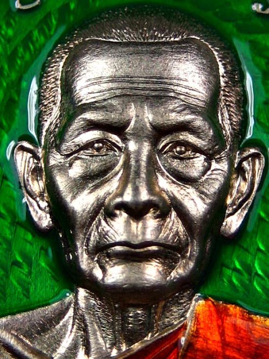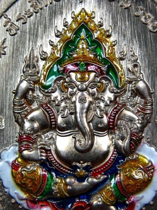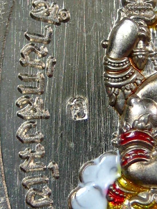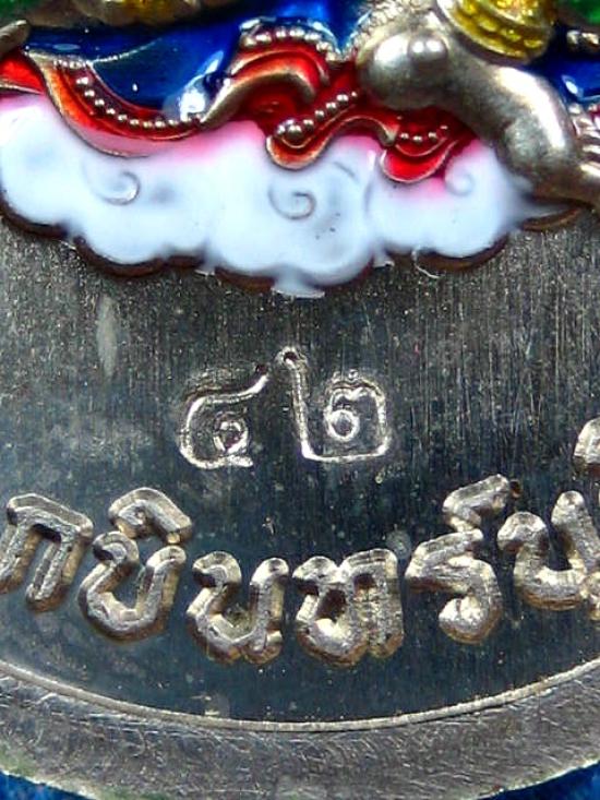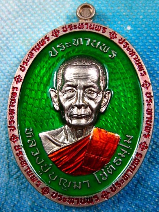 เหรียญรุ่นประทานพร เนื้ออัลปาก้าลงยาพื้นเขียว ลงยาประทานพรขอบ ลงยาจีวร หลังลงยาเครื่องทรง พระพิฆเนศ หลวงปู่บุญมา โชติธมโม สำนักสงฆ์เขาแก้วทอง (---A81---) |