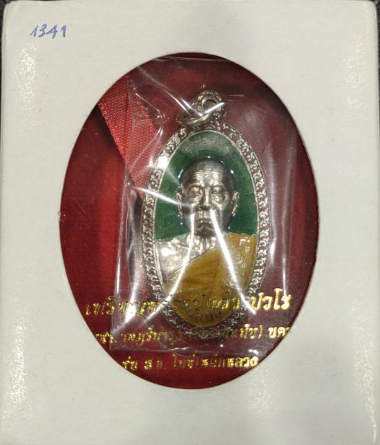 | เหรียญใบขี้เหล็ก รุ่น "ส.ธ. ใบขี้เหล็กหลวง" หลวงปู่แผ้ว ปวโร วัดประชาราษฎร์บำรุง(รางหมัน) อ.กำแพงแสน จ.นครปฐม เนื้อเงินลงยาเขียว เลข 1341 กล่องเดิม |