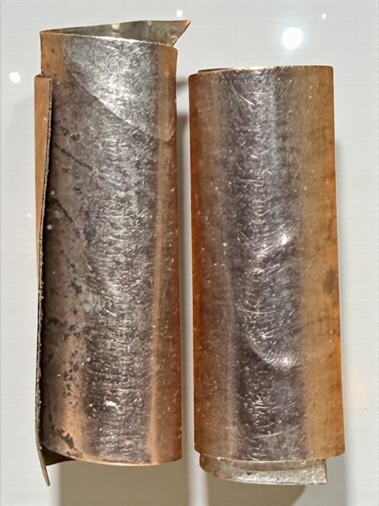 ตะกรุด"คู่" นาคแท้ ไม่ทราบที่ มากับใบเช็ค % ทองคำ มีทองคำ 29.3% มีรอยจาร ขนาด 1 ซม. หนักรวม 0.18 กรัม |