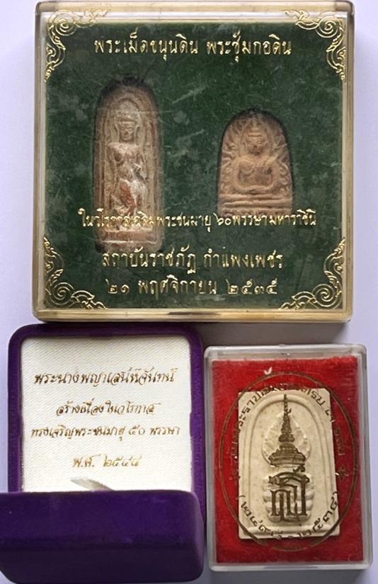 พระซุ้มกอ+ลีลาเม็ดขนุน หลัง สก60 พรรษา มหาราชินี สถาบันราชภัฏกำแพงเพชร ปี35 เนื้อดิน + นาคปรก 3รอบ สธ ปี34 เนื้อผง+นางพญาเสน่ห์จันทร์ 50 พรรษา สมเด็จพระเทพฯ ปี48 เคาะเดียว |