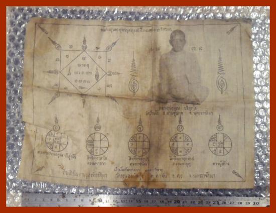 250-ผ้ายันต์ หลวงพ่อคูณ ที่ระลึกงานผูกพัทธสีมา วัดหนองบัวทุ่ง นครราชสีมา พศ.2520 (ขนาดประมาณ 8.5 x 11.5 นิ้ว) ปั๊มตรายางวัด |