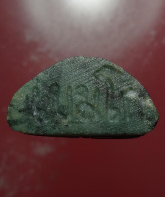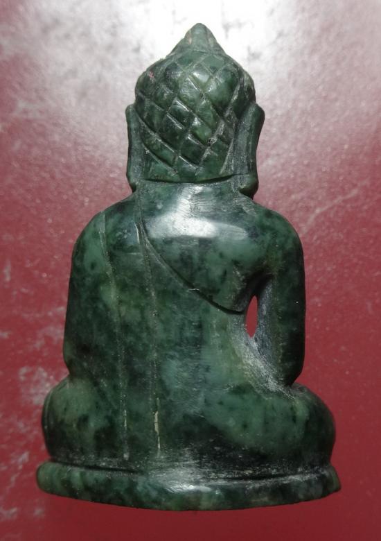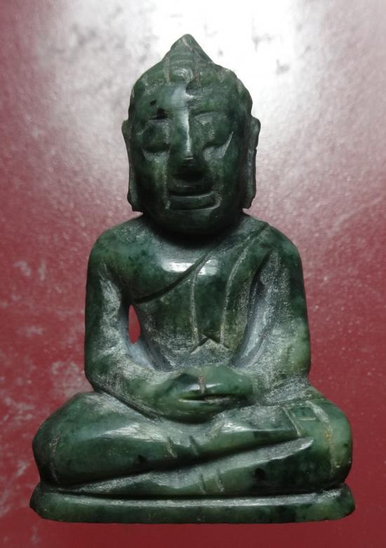 พระพุทธเนื้อหินคล้ายหยก ใต้ฐานจารคำว่าเขมโก |