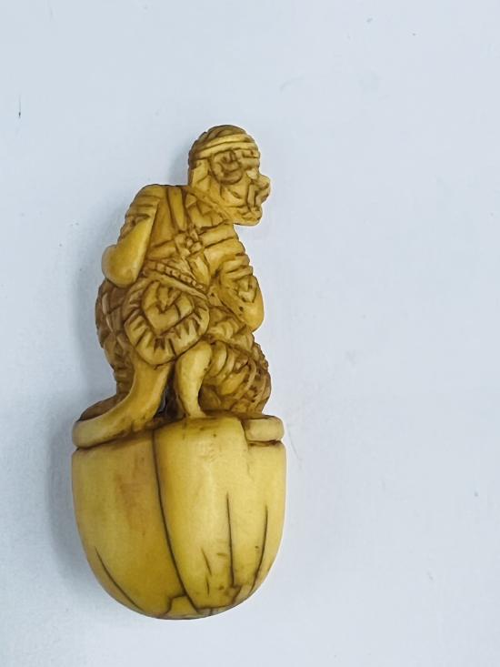 วัดใจ หนุมานนั่่งถืออาวุธ งาแกะไม่ทราบเกจิ สูง 1.5 นิ้ว