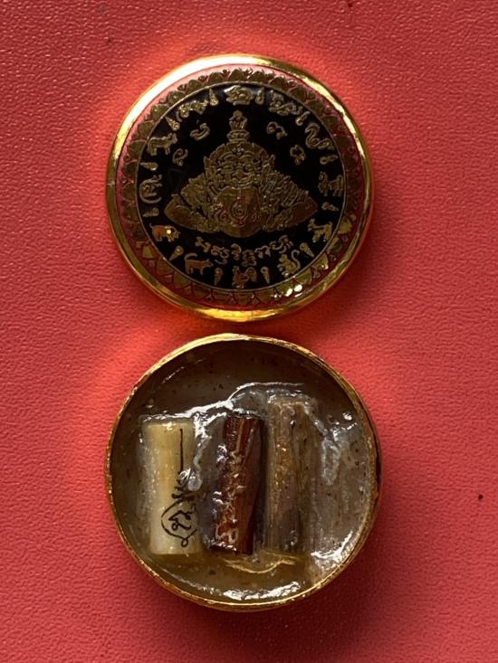 เคาะเดียวแดง สีผึ้งพระราหู รุ่น มงคลจักรวาล เนื้อ โลหะชุบทองลงยาดำขอบแดง ขนาด3.2ซม |