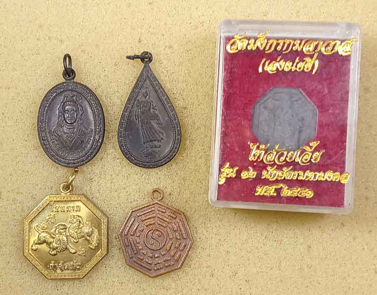 เหรียญเจ้าแม่กวนอิม 2 เหรียญ + พระผงแปดเหลี่ยม เทพเจ้าไท้ส่วยเอี้ย เทพเจ้าคุ้มครองดวงชะตา ว ัดเล่งเน่ยยี่ + เหรียญโชคลาภวัดป่าสัก ชัยนาท + เหรียญยันต์ |