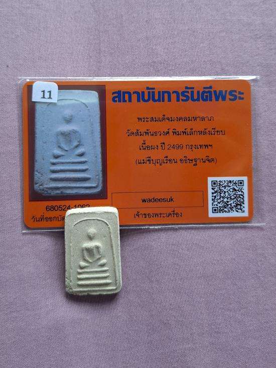 ชื่อพระเครื่อง พระสมเด็จมงคลมหาลาภ วัดสัมพันธวงศ์ พิมพ์เล็กหลังเรียบ เนื้อผง ปี 2499 กรุงเทพฯ (แม่ชีบุญเรือน อธิษฐานจิต)