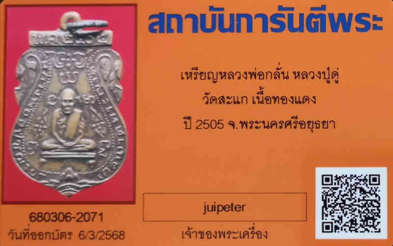 เหรียญหลวงพ่อกลั่น หลวงปู่ดู่ วัดสะแก เนื้อทองแดง ปี 2505 มีจาร เดิมๆ พร้อมบัตรรับรอง G-PRA
