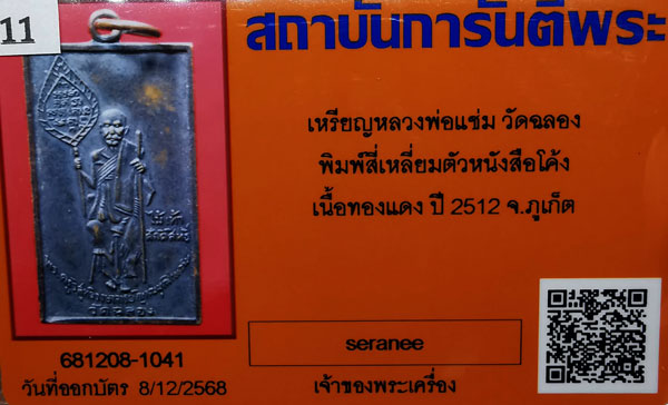 เหรียญหลวงพ่อแช่ม วัดฉลอง พิมพ์สี่เหลี่ยมตัวหนังสือโค้ง เนื้อทองแดง ห่วงเดิม ปี2512 จ.ภูเก็ต + บัตรG-pra สภาพเดิมค่ะ สภาพตามรูปทุกประการค่ะ