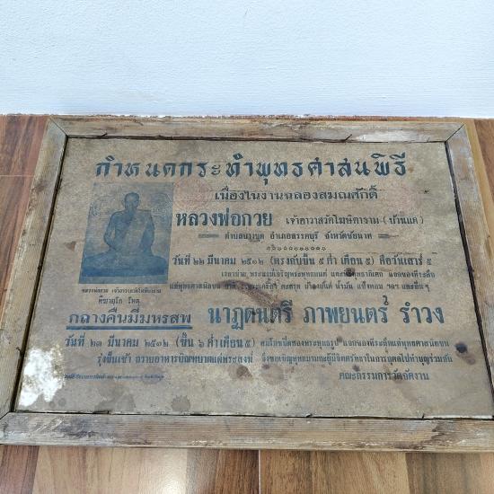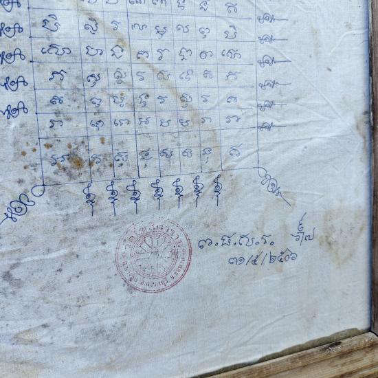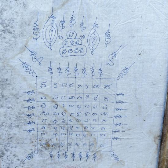 ผ้ายันต์จารมือเก่าเก็บ วัดโฆสิตาราม ด้านหลังใบกำหนดการฉลองสมณศักดิ์ หลวงพ่อกวย วัดใจ