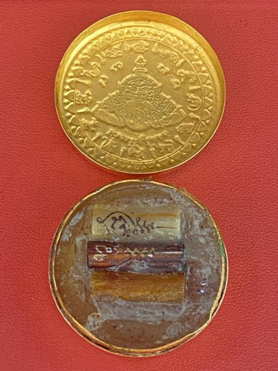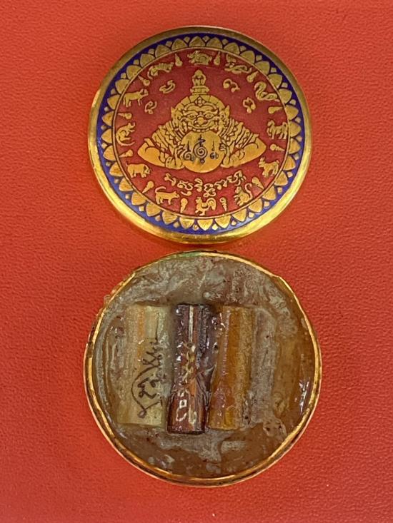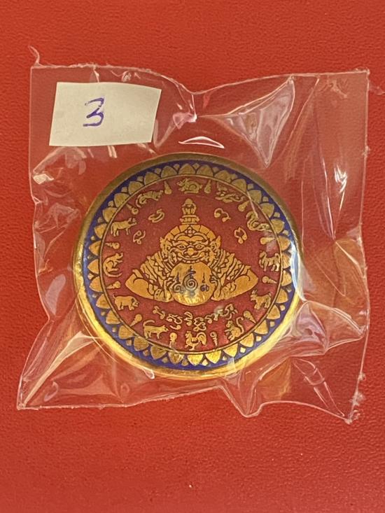 เคาะเดียวแดง สีผึ้งพระราหู รุ่น มงคลจักรวาล เนื้อ โลหะชุบทองลงยาสีแดงขอบสีน้ำเงิน ขนาด3.2ซม |