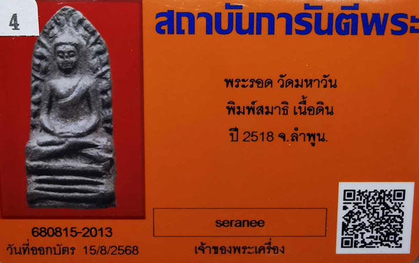 พระรอด วัดมหาวัน พิมพ์สมาธิ(มีหน้าตา) เนื้อดิน ปี2518 จ.ลำพูน + บัตรG-pra สภาพเดิมค่ะ สภาพตามรูปทุกประการค่ะ |