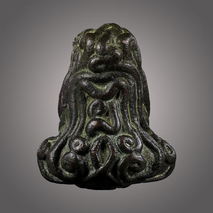 พระปิดตา พิมพ์ยันต์ยุ่ง (ไม่ทราบที่สร้าง) เนื้อสัมฤทธิ์เก่ามีอายุ ขนาดพระฐาน 1.5 cm สูง 1.8 cm